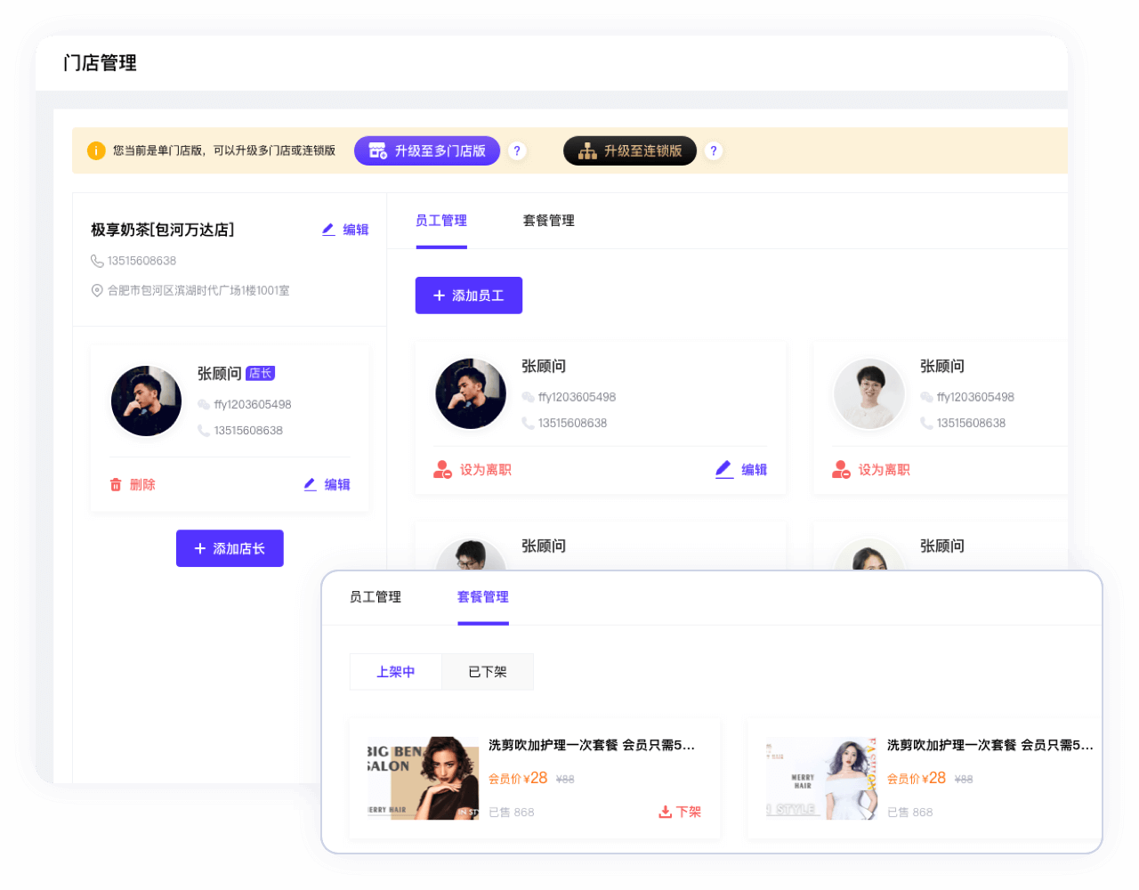 支持多门店,商户添加门店可以自定义门店名称,便于用户识别;添加编辑修改店长,员工管理,套餐管理。单门店可以升级至多门店版。