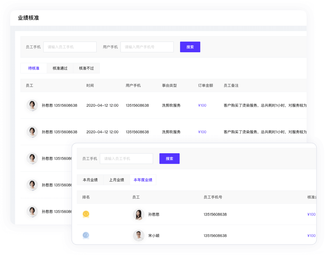 业绩排行:商户可以查看本月业绩、上月业绩、本年度业绩,根据员工的业绩金额来排名的。