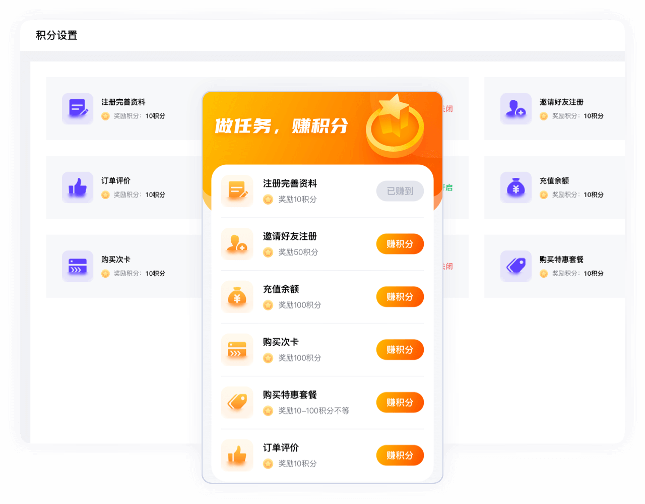 用户积分获取有6大途径(注册完善资料、邀请好友注册、订单评价、充值余额、购买次卡、购买特惠套餐),商家可开启或关闭这些途径,并对其设置相应的积分。