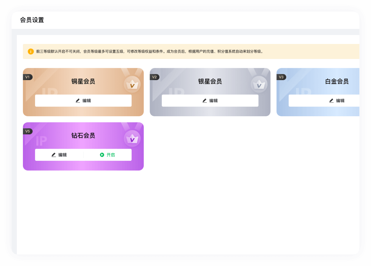 商户可对本店会员等级进行设置,前三等级默认开启不可关闭,会员等级最多可设置五级,可修改等级权益和条件。成为会员后,根据用户的充值、积分值系统自动来划分等级。
